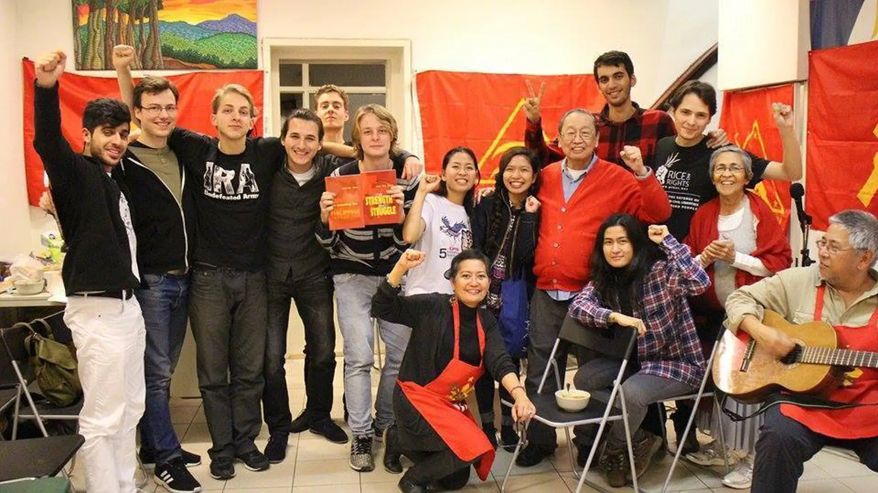 Het verhaal van “Left Laser” begint in Utrecht in 2015.3 Een groep jonge communisten treft elkaar in een zaaltje behangen met rode vlaggen met revolutionaire symboliek. Men besluit een groepsfoto te maken, vuisten de lucht in, boek in de hand. De jongen met het boek, Building Strength through Struggle, verdient extra aandacht. Het is Bob Scholte. Twee personen scheiden hem van een oudere Filipijnse man met een vriendelijk voorkomen. Dat u hem niet kent is een toeval van de geschiedenis. In een andere tijdlijn had deze man in de boeken gestaan tussen Mao Zedong, Fidel Castro en Pol Pot, maar de revolutie van José María Sison wierp nooit zijn vruchten af. Daarom leefde hij van 1987 tot zijn dood in 2022 in ballingschap in Nederland en daarom staat hij op deze foto, in Utrecht, in 2015.